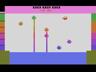 Not bad, but not great. The gameplay was pretty simple. There is a giant pool of water that you need to keep full (I guess the water is providing relief for some nameless town and they will die without it). The antagonists are round colorful creatures with the apropos name “Thirsties”. These thirsties live up to their name, and are so desperate they have turned to drinking pool water to slake their unending thirst. I’m not sure if you have ever accidentally (or purposefully) swallowed a mouthful of pool water before, but take my word; it is not a remedy for thirstiness. Kool-Aid is better for the thirsties, so you need to provide them with the alternative of this life-saving elixir. When a “thirsty” is traveling back and forth, leave him alone (mind your own business!) otherwise they will bump you and you will lose time. But when he extends his straw into the pool to begin drinking, you can then use your pitcher (did I mention that in this game you are a pitcher of Kool-Aid?) to touch the thirsty, who will stop drinking pool water and drink you instead! This causes the thirsty to disappear. I guess they drank too much and had to run to the little thirsties room. There were also power-ups you could collect. What were the power-ups? The ingredients to Kool-Aid, of course! Kool-Aid Powder, Sugar, and Water, represented by a letter K, S or W about the size of your pitcher, would periodically appear. Snagging them partially re-filled the pool and could make you invulnerable for a short time, allowing you to quench thirst to your heart’s (assuming Kool-Aid Man has a heart) content.