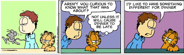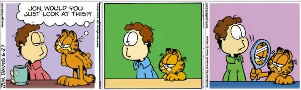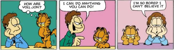 I used to be a fan of Garfield. I thought it was a funny strip, and a funny Saturday morning cartoon. Unfortunately, over the years my enjoyment of this comic strip has waned. How Jim Davis can take these two-dimensional characters and somehow make them one-dimensional is beyond me, but he does it everyday. I'm not exactly sure when Garfield "jumped the shark", or even if such a thing is possible with a comic strip. Maybe it is when his cartoon voice, Lorenzo Music, passed away. Maybe it is when Garfield went CGI in his two atrocious motion pictures. At any rate, it is now almost impossible to enjoy Garfield in it's current form. The problem is, Garfield has been completely explored at this point. Everybody knows that Garfield loves lasagna just as much as he hates Mondays. He refuses to chase mice, but he enjoys killing spiders. Jon is a lovable loser, and Odie is dumb. This ground has been covered umpteen million times, and there is just nothing new under the sun. Garfield just isn't funny anymore, and drastic steps need to be taken to make it funny. I'm not the only one with this impression. The folks behind garfield minus garfield take a stab at making Garfield funny. The concept is simple: they simply remove Garfield and his thought balloons from the strip, so basically it is a strip about Jon, Garfield's owner. They actually do a great job of salvaging the strip, although it goes into a creepy direction. Jon comes across as mentally ill and pathetically lonely, which in retrospect isn't that different from the regular Garfield comic. The Garfield Randomizer is also available for those who want to attempt to make Garfield funny. The concept is simple: Garfield comics make just as much sense, and are just as funny, if you throw random panels together. In fact, sometimes they are even funnier than the original strips.. The original programmer got a cease and desist letter from the Garfield legal team so the original site is gone, but as with anything on the Internet, the "cat" is already out of the bag. Get it? Cat? Garfield? Anyway, he made the code available for people who wanted to try it for themselves. I created some strips using the original Random Garfield Generator. I think they work just as well as any other Garfield strip.